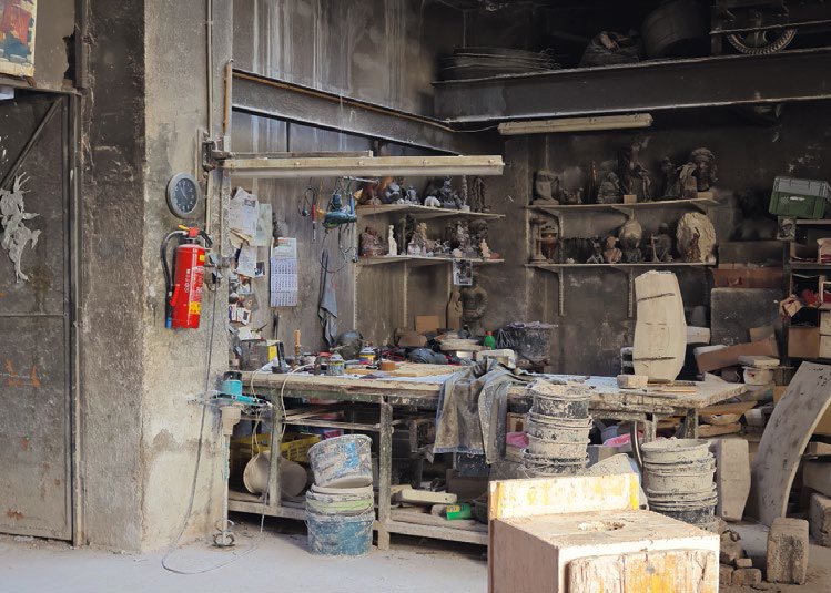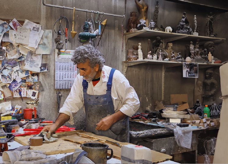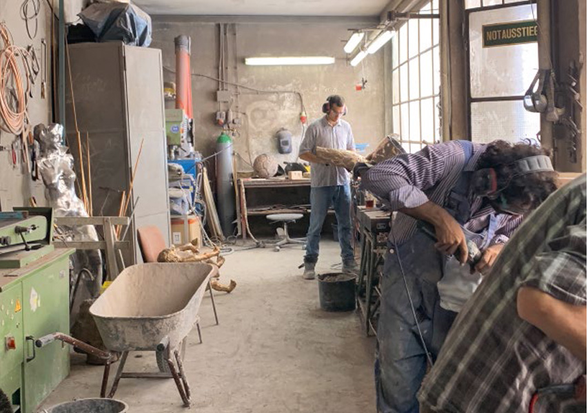 Man gelangt in eine städtische Hinterhofidylle. Ein imposanter Ahornbaum, ein Jauseplatz, Efeu, das an den Hauswänden emporrankt, staubige Sprossenfenster, sich stapelnde Gerätschaften und überlebensgroße Bronze figuren, begleitet von der Geräuschkulisse metallischen Hämmerns und dem Surren mächtiger Maschinen. Öffnet man die Metalltüren, betritt man überwältigt eine über vier Meter hohe unterteilte Werkhalle, ein kreatives Chaos mit System: Öfen und Guss, Metallbearbeitung, Werkzeuge und Maschinen, Werkstücke in verschiedenen Stadien der Fertig stellung, Ruß, Staub, Wachs, Schamott und Gipsformen – eine Mischung aus archaischer Bronzegießerei und Skulpturendepot.