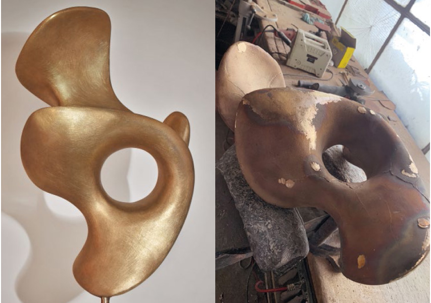 Schmuck und Skulptur verbindet ihre handwerkliche Herstellung. Beide Werkgruppen sind Ausdruck meiner Formensprache. Schmuck ist unmittelbar und hautnah, kann begleiten wie ein Talisman. Er betont die Individualität und beflügelt Facetten der Persönlichkeit. Im Gegensatz zum handschmeichelnden Ertasten eines Schmuckstücks ist die Skulptur ein Gegenüber im Raum – umrundbar und wandelbar je nach Blick winkel. Die Sichtweise des Betrachtenden wird herausgefordert und befragt.